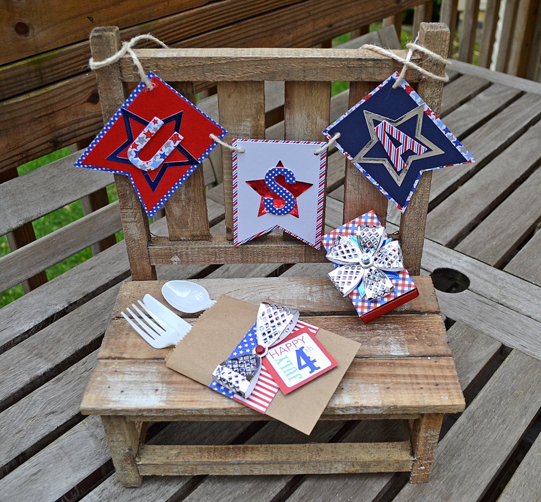 With the 4th of July about two weeks away, I thought I might inspire you to start a little early by sharing my three piece ensemble. Grabbing my Contour™ Steel Rule Dies, I created a banner, matchbox party favor and utensil holder to make my set.