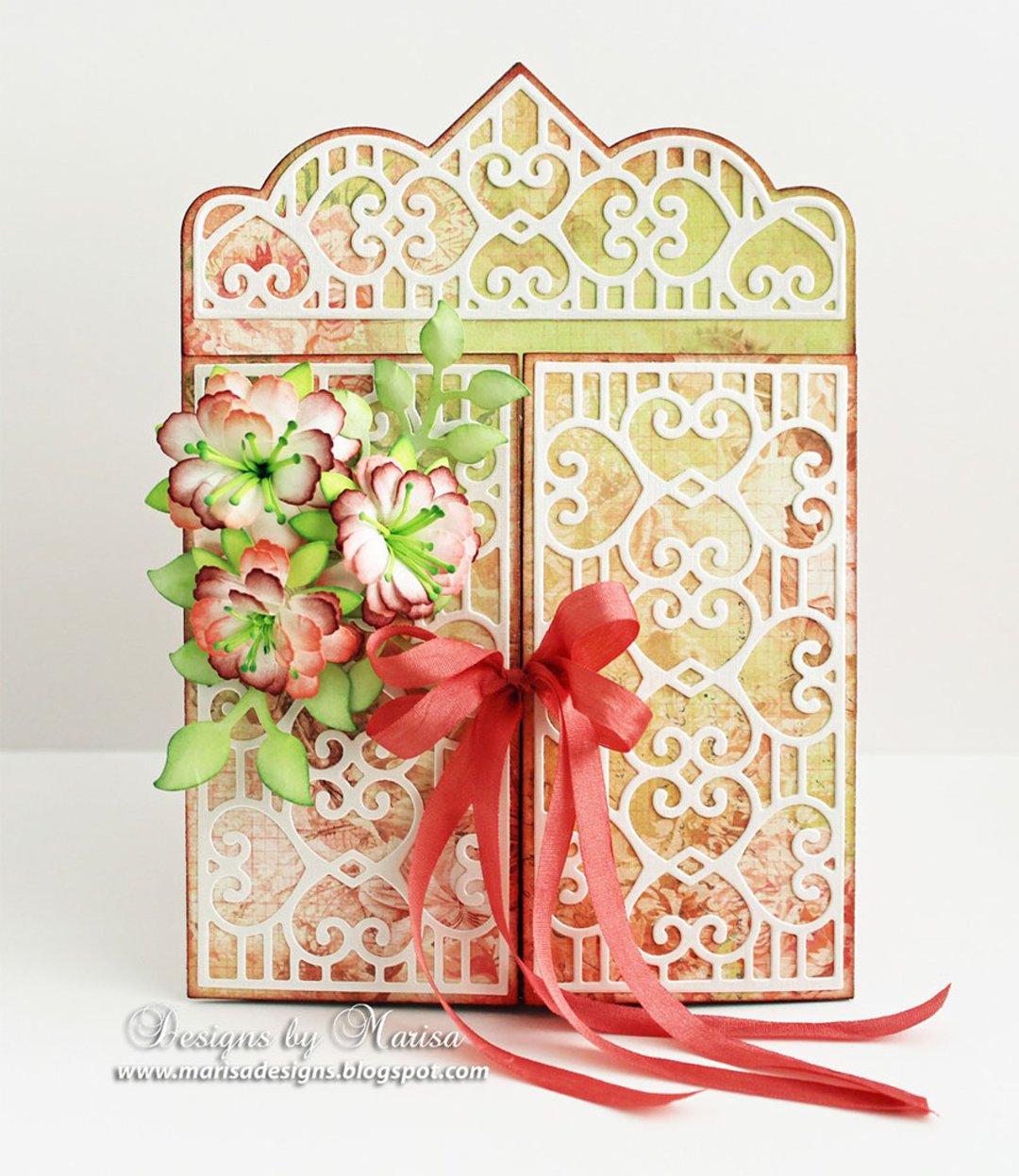 6. Punch a small hole to the center of each panel for ribbon. Decorate card with Rolled Flowers and Layered Leaf Vines. Make a bow in the center to close card.